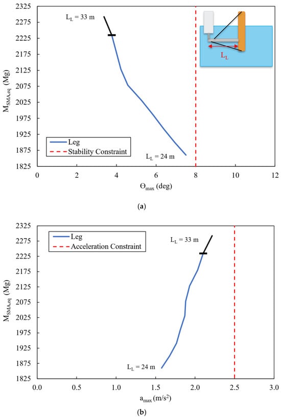 Like the cans, the black portions of Figure 10 represent LL that do not meet the kmin constraint. As LL decreases from 32 m to 24 m, MSMA,eq decreases, and the kmin constraint is met. If LL is reduced below 24 m, the system becomes dynamically unstable (the simulation could not complete the full runtime) because of an insufficient restoring moment. As LL decreases, ϴmax increases (Figure 10a) because the second area moment of the water plane area has been reduced, resulting in a reduction in the pitch stiffness of the substructure, which also leads to a reduction in amax below the imposed constraint. For the next component optimization, a 24 m leg length was chosen as it provided the lowest MSMA,eq while meeting all system constraints.