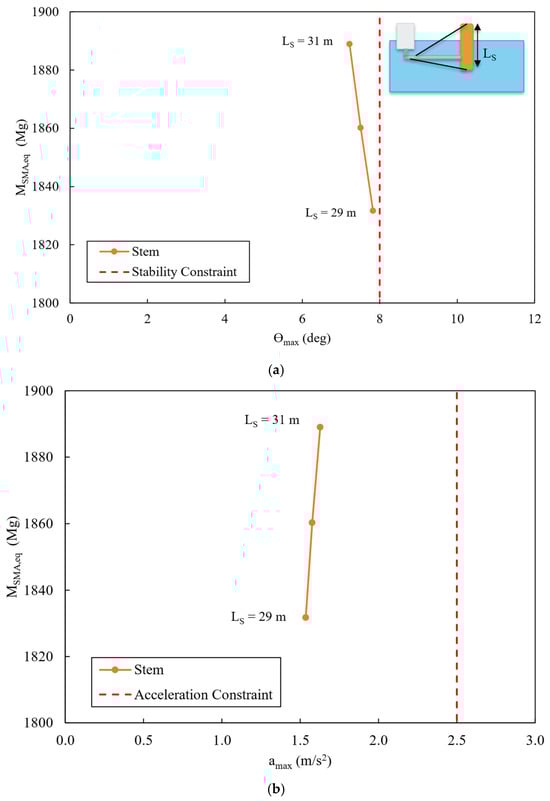 As LS decreases, the system draft and stem outer diameter both decrease, and ϴmax increases, but both MSMA,eq and amax decrease. Note that the freeboard height, stem slenderness ratio, and stem wall thickness are held constant, so the stem draft and outer diameter decrease for shorter stem lengths. Changes to MSMA,eq are directly related to changes in LS and, in turn, the stem concrete mass. The increase in ϴmax and decrease in amax with a reduction in LS can again be explained by the reduction in pitch hydrostatic stiffness following the change in GM (G and B both rise, but G is above B, and the second area moment of the water-plane area reduces, thus the GM reduces). A 29 m stem length was selected as optimal because it is the length that minimizes SMA equivalent mass while meeting all system constraints.