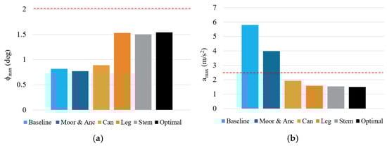 The same trend does not appear for amax as the acceleration decreases with increased can draft. This decrease in acceleration can be explained by a decrease in stiffness, leading to a decrease in the pitch frequency. It should be noted that when compared with changes to the mooring system, there are multiple can configurations that meet the amax constraint, illustrating that changes to both the mooring system and cans are required to meet all design constraints. Concluding this evaluation, a 16 m can length and 10 m can draft were selected as the optimal values for the cans, rendering the lowest SMA equivalent mass while meeting all constraints.