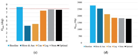 The optimal values at each component step for MSMA,eq, ϴmax, ϕmax, and amax, along with respective constraints, are shown in Figure 12. On the other hand, the key component design variables and constraint differences between the baseline and optimal parked substructure configuration are listed in Table 6. Comparison between the equivalent and actual component mass distributions of the optimal parked substructure configuration can be found in Figure A3 of Appendix A.