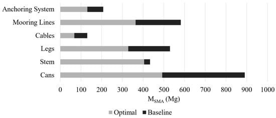 In Equation (2) fm is the material factor, ff is the fabrication factor, fi is the installation factor, and Mj is the j-th component mass. In this form, the material factors are the price-per-kg of material normalized by the price-per-kg of steel (Psteel), so the material cost for a component is mjfm,jPsteel. The fabrication and installation factors are the fabrication and installation costs relative to the material costs. Including these factors when comparing FOWT designs (instead of just considering total material costs) allows for a more realistic and comprehensive evaluation of turbine designs across sites and points in time. These non-dimensional factors are unique depending on the component material, design, and installation requirements, and they are listed in Table 1 for the SMA components, based on recent cost estimations [8,16]. Using this approach, the sum of the component equivalent masses is the SMA equivalent mass () of Equation (3), which is proportional to the total CapEx for the system as noted in Equation (4). Assuming a fixed turbine design with a set annual energy production for a given site (as is the case here), minimizing the SMA equivalent mass is equivalent to minimizing the LCOE of the system.