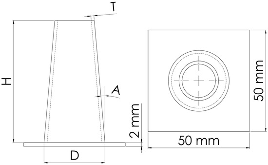 A tapered-tube geometry was adopted in this study to evaluate and compare the crashworthiness performance of different FDM materials, as tapered configurations have demonstrated superior energy-absorption characteristics to straight tubes [36]. All the specimens maintained a constant height (H) of 60 mm and an outer base diameter (D) of 30 mm, where T denotes the wall thickness and A represents the taper angle. To systematically investigate the influence of geometrical parameters, three wall thicknesses (1.0 mm, 1.5 mm, and 2.0 mm) and three taper angles (0°, 2.5°, and 5.0°) were selected. This full factorial design resulted in nine distinct geometric configurations. Each configuration was fabricated once using PLA+ and once using PLA-CF, yielding a total of 18 specimens for crash testing. A 50 mm × 50 mm × 2 mm base plate was integrated into the bottom of each specimen to ensure stability during compression testing. The geometry and dimensional specifications of the specimens are illustrated in Figure 1, while the specific configurations of wall thickness and taper angle used in the study are summarized in Table 1.