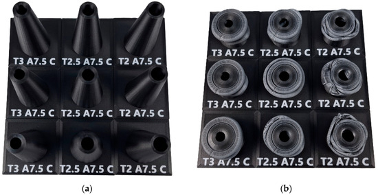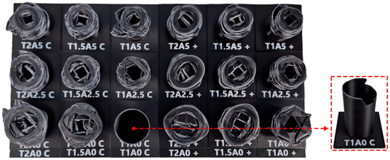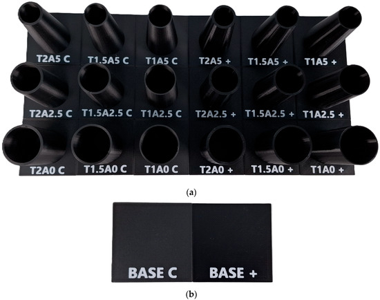 Figure 2a displays the final printed specimens, each labeled on its integrated base for identification. These alphanumeric labels denote specific geometrical and material attributes; for instance, “T2A0C” corresponds to a 2 mm wall thickness, 0° taper angle, and PLA-CF material, while “T1A2.5+” represents a 1 mm wall thickness, 2.5° taper angle, and PLA+ material. For each PLA+ and PLA-CF specimen, a separate base (50 mm × 50 mm × 2 mm) was 3D printed, as illustrated in Figure 2b.