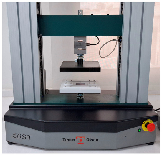 Quasi-static axial compression tests were conducted at room temperature to assess the crashworthiness of the fabricated specimens. A Tinius Olsen universal testing machine (Model 50ST), manufactured by Tinius Olsen (Horsham, PA, USA) and equipped with a 50 kN load cell, was used for testing, as shown in Figure 3. Prior to testing, the specimen’s total mass, including the base, was measured, and the mass of the base was subtracted to determine the mass of the specimen alone. The specimens were placed between the two flat plates of the testing machine. The lower plate incorporated a 3D-printed frame with a groove (50 mm × 50 mm × 2 mm) that securely held the specimen base in position, ensuring proper alignment and preventing slippage during compression, as shown in Figure 3. The upper plate moved downward at a speed of 5 mm/min [38,39], applying a compressive force on the specimens, with the crushing displacement set to 2/3 of the specimen’s original height [33,40]. Force-displacement data were continuously recorded during the compression tests.