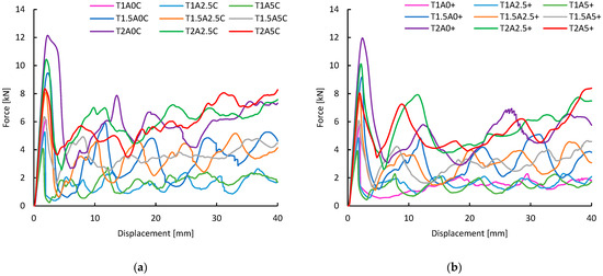 The force-displacement curves for the different design configurations are presented in Figure 5. The curves reveal varied behaviors under axial compression, with the majority of configurations showing consistent and uniform plastic deformation, except for T1A0C, which displayed brittle fracture. The was observed within the displacement range of 1–5 mm for all configurations. The highest was recorded for T2A0+ and T2A0C, at 11.963 kN and 12.155 kN, respectively. In contrast, the lowest values were observed in T1A5+ and T1A5C, with forces of 3.934 kN and 4.084 kN. After reaching their peak, all the specimens transitioned into a more stable force region, where the load fluctuated around a mean crush force, indicating continuous energy absorption.