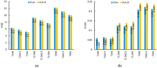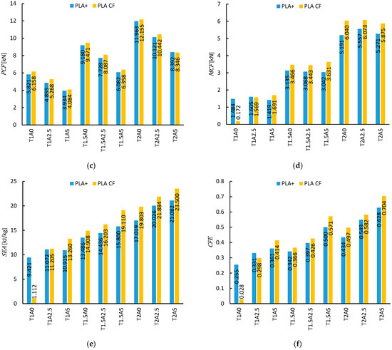 The crashworthiness indicators , , , , and for the various design configurations fabricated from PLA-CF and PLA+ are presented in Table 4, including the mass of each specimen. Column charts are utilized to visually present the mass and the crashworthiness indicators, as illustrated in Figure 6. The mass of the specimens clearly depends on both the geometric configuration and the material type. Specifically, the mass increases with wall thickness and decreases with larger taper angles. PLA-CF consistently displays values comparable to or slightly lower than PLA+, which is attributable to its slightly lower density (1.21 g/cm3) relative to that of PLA+ (1.23 g/cm3). The highest mass, recorded in T2A0C and T2A0+, is 12.2 g, while the lowest, observed in T1A5C, is 5.1 g.
