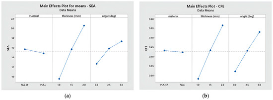 In this study, Taguchi analysis was conducted using Minitab statistical software (version 19) to investigate the influence of design parameters on crashworthiness performance. The main effects plots for means provide a clear visualization of how each factor level affects the response variables. These plots, shown in Figure 7, highlight the trends in and across different parameter levels. These trends suggest that the use of PLA-CF over PLA+ and increasing both thickness and taper angle can improve both SEA and CFE.