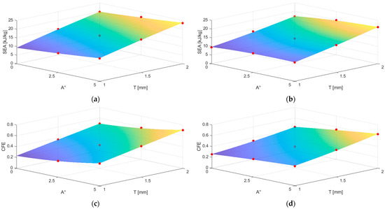A statistical analysis of variance (ANOVA) was performed using Minitab statistical software (version 19) to quantitatively assess the effects of the geometric and material parameters on crash performance. The factors included the continuous variables (thickness and taper angle) as well as the categorical variable (material type). The ANOVA results are listed in Table 6 and Table 7. Thickness is the most influential factor, accounting for 73.18% of the variation in and 58.19% in , confirming that increasing wall thickness substantially improves crash performance. Taper angle contributes 13.49% of the variation in and 31.49% in , highlighting the importance of geometric design in crashworthiness optimization. Material type accounts for smaller contributions of 0.66% in and 0.11% in . The residual error accounts for 12.67% and 10.22% of the variation in and , respectively. For both SEA and CFE, the p-values corresponding to thickness and angle indicate that the ANOVA results related to these parameters are statistically significant, whereas the p-values corresponding to material show that the ANOVA results related to material are statistically insignificant.