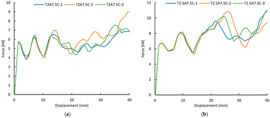 The condition of the T2A7.5C, T2.5A7.5C, and T3A7.5C specimens after the compression tests is shown in Figure 9b. Each configuration was tested three times, and the mean values, along with the corresponding standard deviations of the crashworthiness indicators and specimen mass, are presented in Table 9. In addition, the corresponding force-displacement curves for all three replicates of each configuration are illustrated in Figure 10. Among the configurations, T3A7.5C consistently demonstrated the highest performance, achieving an average of 32.086 ± 0.190 kJ/kg and an average of 0.745 ± 0.034. These results confirm the superior crashworthiness of the T3A7.5C design and validate the positive influence of increased thickness on both and . The low standard deviations reported indicate good repeatability of the experimental results, supporting the reliability of the regression model-guided design strategy.