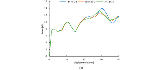 Force-displacement of the three test replicates for each proposed design configuration: (a) T2A7.5C; (b) T2.5A7.5C; (c) T3A7.5C.