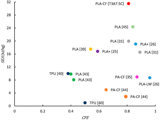 Comparison of and values for tubular crash boxes manufactured using the FDM process in recent studies [25,26,31,35,39,40,43,44,45].