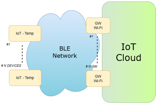 Although Figure 2 depicts multiple IoT-Temp Nodes and gateways to illustrate the system’s scalability, the experimental setup involved only one IoT-Temp Node and two identical gateways placed at different locations within the laboratory.