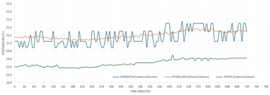 As illustrated in Figure 9, the temperature trends recorded over a 720-min period were generally consistent across the three sensors used. Notably, the internal sensor (HY0020) and the external sensor (Si7020-A20) exhibited closely aligned readings, with the external sensor demonstrating greater stability over time. This enhanced stability is attributed to its higher sampling frequency—400 ksps for the Si7020-A20 compared to 200 ksps for the HY0020—which allows for more frequent and precise data acquisition.