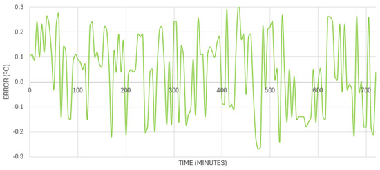 Most of the observed errors fell within the range of −0.3 °C to +0.3 °C, indicating good relative accuracy of the internal sensor. Minor periodic oscillations of very small amplitude were detected, which may be attributed to stable environmental influences or inherent sensor limitations such as resolution or latency. Importantly, there is no evidence of systematic drift over time; the errors appear to have been randomly distributed around zero, suggesting the absence of significant bias.