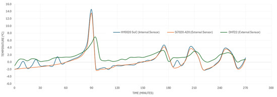 The aim of this experimental setup was to compare the accuracy of the internal HY0020 sensor with that of the external Si7020-A20 and DHT22 sensors under both stable and dynamic thermal conditions. This comparison provides insight into the reliability and suitability of the internal sensor for thermal monitoring in IoT applications, particularly in scenarios characterized by significant temperature variation.