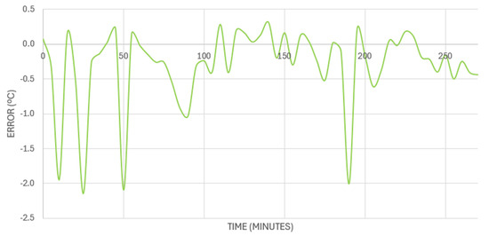 Although the overall statistical stability remained good, certain time points exhibited relatively significant deviations. The biggest errors were noticed at 10, 25, 50, and 190 min. Their values were −1.9 °C, −2.1 °C, −2.1 °C, and −2.0 °C, respectively. These deviations were observed at just some specific points, very briefly (initially), and are attributed to sudden environmental changes or delayed thermal response of the internal sensor.