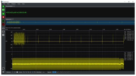 Energy consumption testing of the IoT-Temp Node device was conducted using the Joulescope JS220 meter (Joulescope, Rockville, MD, USA) [41] over a continuous period of approximately two days (2:00:31:48), as shown in Figure 13.