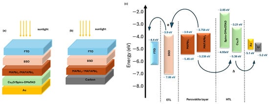 Figure 1a,b illustrate the structure of the PSCs and CPSCs that were used in this modelling study. Figure 1c depicts the energy band alignment of the layers tested in this theoretical investigation.