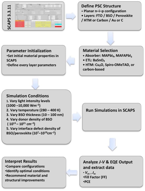 - Son, C.; Son, H.; Jeong, B.S. Enhanced Conversion Efficiency in MAPbI3 Perovskite Solar Cells through Parameters Optimization via SCAPS-1D Simulation. Appl. Sci. 2024, 14, 2390. [Google Scholar] [CrossRef]