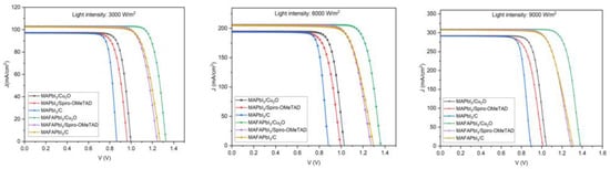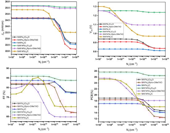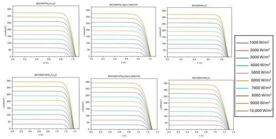- Li, H.; Huang, Y.; Zhu, M.; Yan, P.; Sheng, C. Analyzing Efficiency of Perovskite Solar Cells Under High Illumination Intensities by SCAPS Device Simulation. Nanomaterials 2025, 15, 286. [Google Scholar] [CrossRef]