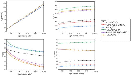 Increased light intensity has noticeably influenced JSC in all devices. It is found that JSC increases linearly with increasing light intensity in all devices, although MAFAPbI3-based devices have a slightly higher influence compared to MAPbI3-based devices.