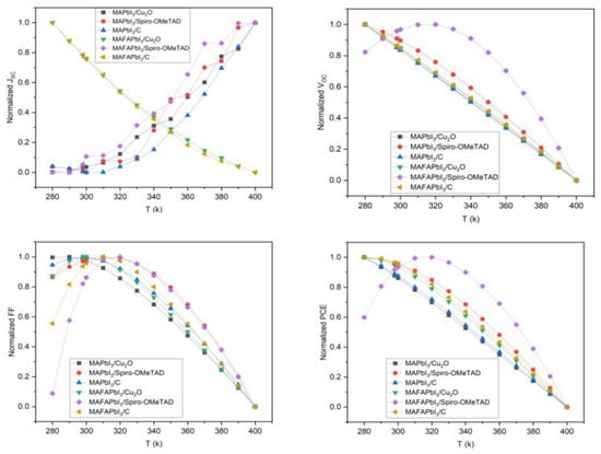 | TiO2/CsPbI2Br C-PSC | −0.23/°C at 200 °C, in reverse measurement | [52] |