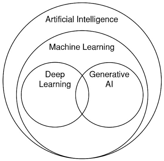Artificial Intelligence (AI) offers a potential revolution in engineering design [12]. It enables learning from examples to provide generalisations even in scenarios where exact rules are impossible to define. This is in contrast to the deductive reasoning offered by classical computing methods. Since the demonstration of the capabilities of Deep Neural Networks (DNNs) with AlexNet in 2012, there has been a surge in AI research, with the seminal work cited by 134,811 articles at the time of writing and “Artificial Intelligence” the subject of 388,943 articles since 2016 (as recorded at 2024-11-12T15:29:23+00:00) [11,13]. In particular, Generative Artificial Intelligence (GenAI) has experienced an explosion of attention with 8948 articles between 2022 and 2024, compared to 1060 articles in the previous two years (2020–2022) [11]. Unlike traditional AI, which is often designed for analysis, classification, decision-making, or prediction, GenAI is used to produce a completely new output that resembles the data used for training. GenAI offers the ability to significantly enhance the design engineer’s toolkit, thus enabling the rapid creation of detailed designs with very little human input [14]. This review acknowledges the often broad definition of AI and that there are techniques that are considered AI but not Machine Learning (ML). Figure 1 gives relative definitions for some of the relevant AI terms as stated by [15].