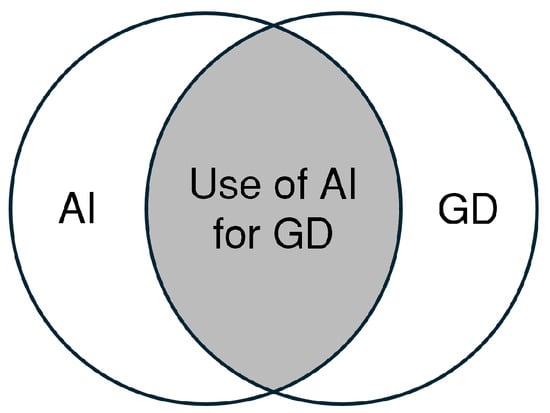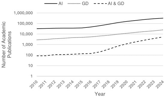 The integration of AI into engineering design is expected to accelerate based on existing trends in the adoption of computational methods for their speed and accuracy [16,17]. The use of AI and the inductive reasoning abilities it provides will enable engineers to tackle both existing and entirely new problems in novel ways [18]. In anticipation of continued development, this review focusses on existing studies at the intersection of GD and AI as presented in Figure 2. Figure 3 demonstrates how the increase in publication rates in the fields of GD and AI corresponds to an increase in the number of studies situated at the intersection of the two fields. The data was collected from [11].