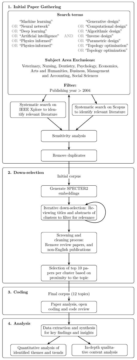 The contribution of this review lies in the identification of trends and opportunities in the use of AI techniques for GD applications. The scope of the review covers mechanical, industrial, civil, and architectural design but does not cover material, chemical, electrical, or electronic design. For example, a study that designed specialised power electronic circuits by selecting the appropriate transistor would not be relevant. However, an investigation into the optimal layout of the circuit’s components to reduce packing volume would be included. In addition, the review is solely interested in the use of AI to influence the design process. Studies concerned only with the use of AI for analysis without the results directly informing or being situated in a design process are therefore also excluded. Unlike traditional reviews that rely solely on keyword search and manual filtering, this review applies a Natural Language Processing (NLP)-based methodology, enabling the discovery and thematic grouping of studies that use diverse terminology or span multiple domains.