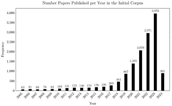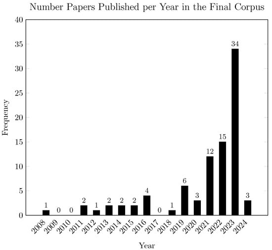 The initial search shown in Figure 4 returned 14,723 papers, which became 14,355 after the removal of duplicates. Meta-analysis of the initial corpus revealed that 69.1% of papers were published after 2021. The year 2024 is not well represented because of data collection occurring during this time. Figure 5 shows the publication rate over time, demonstrating a surge in popularity of the field and therefore its high relevance.