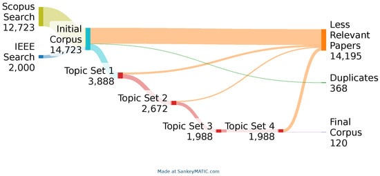 Three down-selection rounds were required following the process described in Section 3.2 before the finishing condition of all topics considered relevant was met. The corpus was then divided into 12 topics, each contributing 10 papers to a final corpus of 120 papers. Figure 6 illustrates this process, demonstrating the steady removal of less relevant studies.
