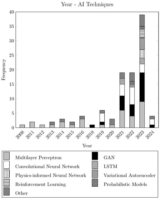 MLP emerged as the most frequently used AI model (32 papers, 34%). Although there has been a modest increase in their implementation over recent years, many contemporary papers have adopted other popular models: GANs (22 papers, 23.4%) and Convolutional Neural Networks (CNNs) (18 papers, 19.1%). Less frequently used models include the VAEs, Long Short-Term Memorys (LSTMs), Physics Informed Neural Networks (PINNs), and RLs, each appearing in <5% of the articles.