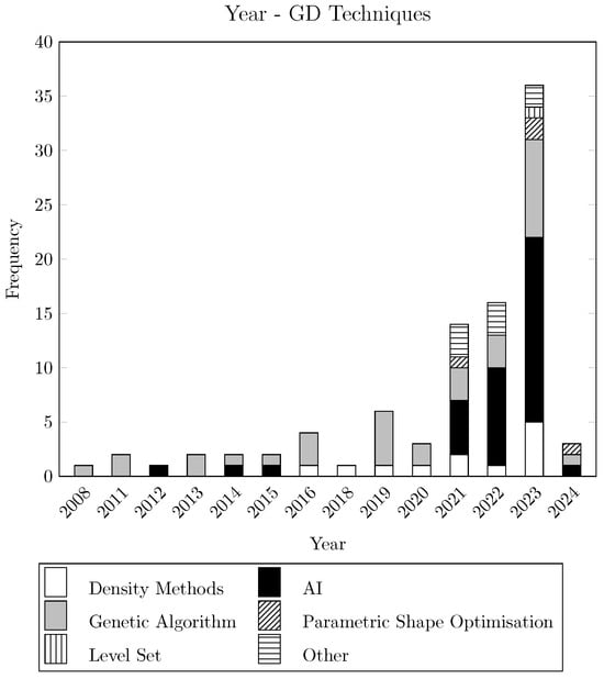 The second stage was a thematic analysis that aimed to identify recurring themes, contributions, and limitations among the selected articles using the assigned codes. Publication frequency, applications, and prevalent AI and GD techniques are visualised using bar charts and proportional stacked charts to highlight temporal trends and emerging techniques. A pairwise analysis was also performed using the codes assigned to the attributes of the studies to examine how specific AI techniques were used in combination with GD methods. For example, the use of surrogate models with Genetic Algorithms (GAs) and design generation using GANs was quantified and contextualised within broader methodological trends. This dual analysis approach ensured a comprehensive understanding of the landscape of AI and GD, integrating quantitative and qualitative dimensions to effectively address research objectives.