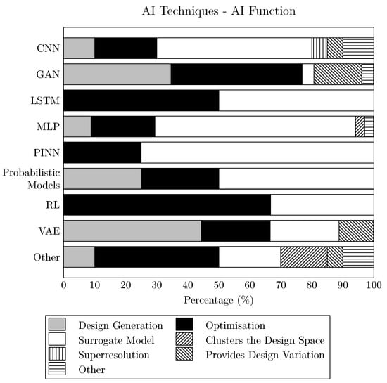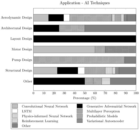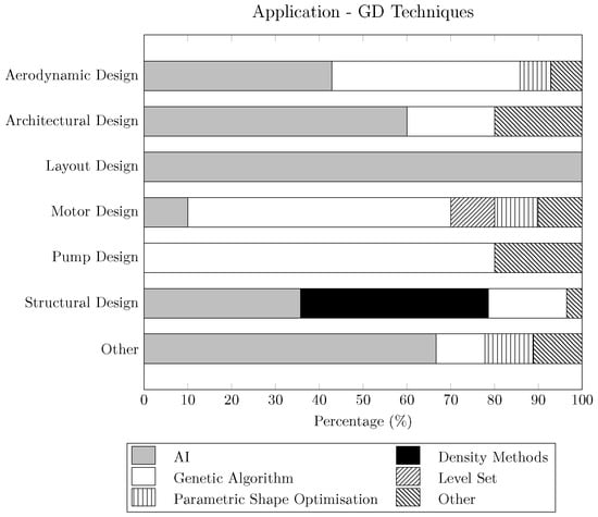 Table 9 lists the application found in the final corpus. Structural Design (27 papers, 30.7%) and Aerodynamic Design (26, 29.5%) were the two most common areas of application. For these, authors focussed on load-bearing components and aerofoils, respectively. Motor Design was investigated in nine (10.2%) of the papers. Researchers used electromagnetic simulations to create the optimal distribution of metal within motor rotors and stators. Pump Design was considered in nine papers (10.2%), where researchers used Computational Fluid Dynamics (CFD) to optimise the geometry of ducts and impellers. Five (5.7%) articles investigated architectural design, mainly using image generation to create floor plans [66,69]. Similarly, the final three (3.3%) studies focussed on more general layout design problems such as tower crane placement [71]. Figure 11 demonstrates which AI techniques were favoured in each of the identified application areas, whilst Figure 12 shows the favoured GD techniques.