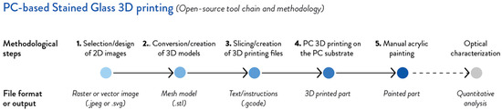 The design methodology presented in this work supports the design and fabrication of customizable 3D printable alternatives to stained glass parts, considering the technical requirements, user’s needs, and aesthetic language. It allows the user to tailor 3D-printable patterns and fabricate their parts, making the design and fabrication of stained glass alternatives more accessible. The methodology to fabricate 3D-printed polycarbonate-based stained-glass window alternatives, as well as the workflow of the experimental activities, followed five steps: