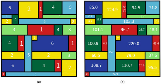 Coloring scheme of the geometric calibration pattern design (SG06), showing the (a) color-coded numbers and (b) area of each colored section in mm2.