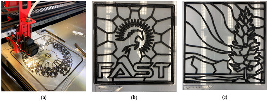 The gcode files were used to fabricate the PC-based 3D design on the PC substrate via FFF 3D printing. An open-source large-format Modix BIG-Meter FFF 3D printer (Modix GmbH, Koblenz, Germany) [60,61] was used to 3D print the customized stained-glass designs with black PC filament (CC3D, Hangzhou Zhuopu New Materials Technology Co., LTD, Hangzhou, China) [62]. The six designs were 3D printed on 304.8 × 304.8 mm PC sheets (Plastic World, North York, TO, Canada) used as substrates, corresponding to an area of 92,900 mm2 (one square foot) [63]. Before the 3D printing process, the PC sheets were secured to the 3D printing bed with duct tape, and the starting z-height was set at the thickness of the sheet, which means 3 mm. The auto-bed-detection thus started the 3D print at just the surface of the PC sheet instead of the regular z-axis value of the first layer, i.e., 0.5 mm (Table 3). In this way, the hotend melted some of the top surfaces of the sheet during the 3D printing process, providing a complete bond between the 3D-printed PC filament and the clear PC substrate.