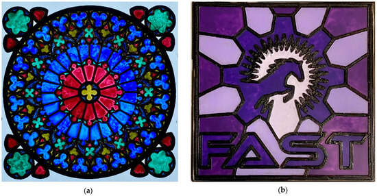 The 3D-printed stained-glass sample design of the online-retrieved designs after acrylic painting: (a) Notre Dame rose window (SG01); and (b) FAST Logo (SG02).
