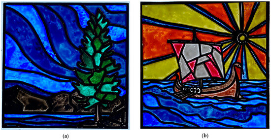 The 3D-printed stained-glass sample designs of the custom patterns after acrylic painting: (a) Northern Lights (SG03, digitally hand-drawn image); and (b) Viking Ship (SG04, digitally acquired hand-drawn image).