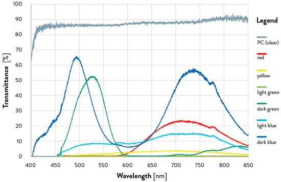 The optical transmission of the colored PC sheets was measured from 200 nm to 1040 nm to determine the optical transmission of the acrylic paints. Data were then plotted from 400 nm to 850 nm to focus the analysis on the visible spectrum region and the first portion of the near-infrared spectrum, according to the application studied in this work. A blackout and full light calibration spectra were run to set up the spectrometer. The transparent PC squares were then placed on the light side flush with the side of the cuvette hole to obtain the spectral transmission of the 3 mm thick PC, which was 87.3. This procedure was repeated for the painted PC squares of each of the six colors used for validation, i.e., red, yellow, light green, dark green, light blue, and dark blue. Ocean View software was used to control the spectrometer and process measurements (Ocean Optics, Gamble Technologies Limited, Mississauga, ON, Canada) [64].