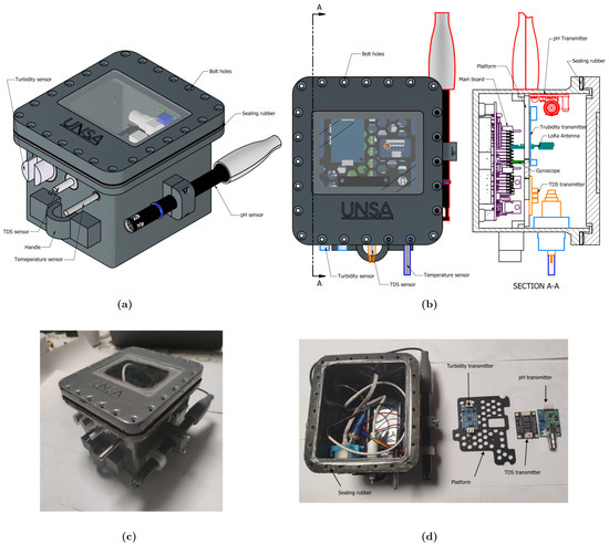 The module was fabricated by 3D printing, employing PLA+ for its superior strength and printing convenience. The sensors (pH, TDS, turbidity, and temperature listed in Table 1) extend from the module, oriented downwards. It also has a cover with holes for bolting and a small window to view the operating indicators of the circuits inside. A second level was incorporated to accommodate the sensor transmitters, as illustrated in Figure 2, which depicts the design drawing with its components. Additionally, the SSM is energized by a solar panel during daylight hours and is equipped with two 3.7 V 1400 mAh batteries arranged in parallel for nocturnal functionality.