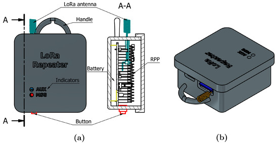 The repeater design is simpler than the previous node; it is smaller due to the number of components inside, as shown in Figure 3. It includes a button for dynamic power configuration with the gateway, indicator LEDs for message reception and transmission, and a 3.7 V battery.