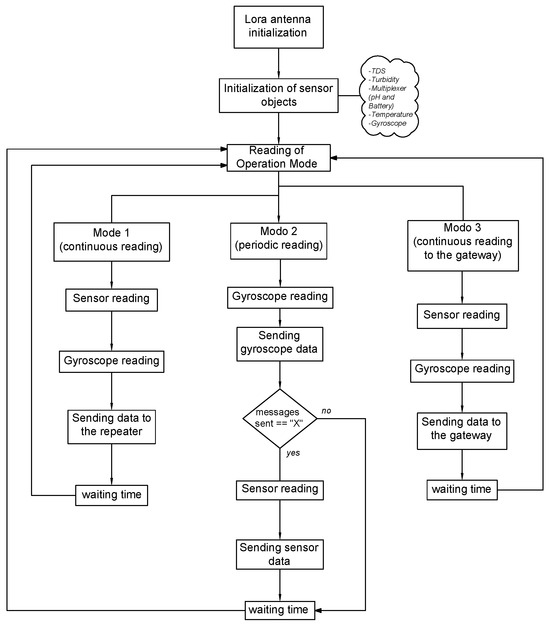 As initially mentioned, the SSM consists of 3 operating modes that are interchangeable with each other; a program flow diagram is presented in Figure 5. The first mode emphasizes continuous data transmission to the LRR at brief intervals to obtain real-time information; however, this mode is subject to governmental regulations in the region of the prototype’s implementation, as the interval between messages is predetermined. In the second mode, position and angular velocity data are sent constantly at 1 s intervals, while sensor data is sent every 5 s. This value was chosen for practical purposes; however, it can be changed as needed. In the third mode, messages are routed directly to the gateway without going through the LRR.