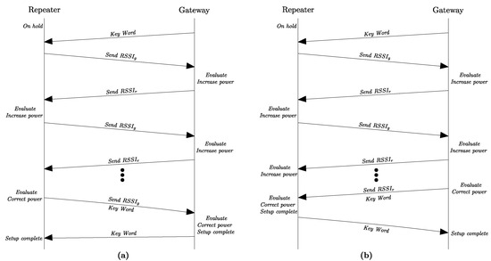 Dynamic Power Configuration where is the RSSI of the Gateway message and is the RSSI of the Repeater message. (a) Scenario where the repeater finishes its power configuration first. (b) Scenario where the gateway finishes its power configuration first.