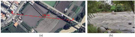 Location of the Chili River, where field tests were conducted. (a) Distance between the gateway and the repeater. (b) River flow during the rainy season.