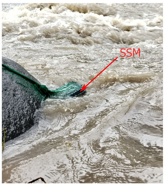 Initially, testing was performed just on the hermeticity of the SSM, resulting in unfavorable outcomes due to the print resolution and the material’s adhesion to its different layers. For this reason, an epoxy paint coating was added to cover the small gaps where water leaked in. It was tested under controlled conditions at a depth of around 1 m, a distance sufficient for field evaluation, with promising results without any leaks. Figure 7 highlights the vigorous river flow during the rainy season, so a small fishing net was used to secure it and ensure the river current did not sweep the module away (Figure 8).