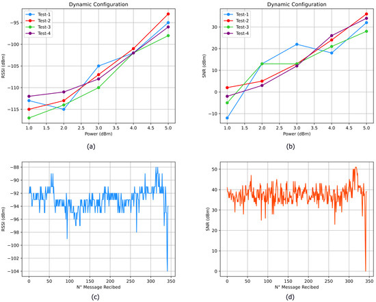 During the setup testing, the points indicated in Figure 7 were taken, with the LRR positioned on the bridge. Four tests of the algorithm were performed, and as anticipated, the RSSI values improved with increasing power (Figure 9). Similarly, the SNR values also have the same behavior. The placement of the repeater and the gateway facilitates the configuration since there is an absence of fixed obstacles that could interfere with the configuration.