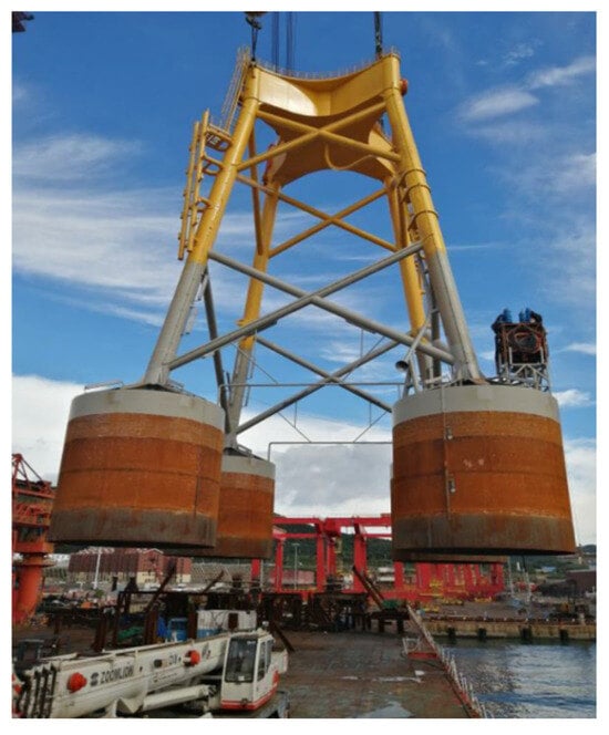 In recent years, offshore wind power has experienced rapid development worldwide, with China playing a leading role. According to the Annual Wind Report 2022 published by GWEC, in 2021 new offshore wind installations reached 21.1 GW, of which China accounted for 80%. Approximately half of these projects utilized bucket-type foundations, such as mono-bucket foundations (MBFs) and Bucket-Based Foundations (BBFs). Figure 1 shows a typical BBF installed in north China, comprising a jacket structure supported by four large suction buckets. MBFs and BBFs have become widely recognized as cost-effective and environmentally friendly alternatives to traditional driven piles for offshore foundations [1,2,3]. Therefore, understanding both the failure mechanisms and bearing capacity of MBFs under realistic conditions is essential for their safe and efficient design.