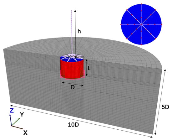 The bearing capacity of an MBF was investigated through numerical simulations using FLAC3D (Fast Lagrangian Analysis of Continua in 3D) under the desired in situ conditions. Figure 2 depicts the numerical model design of the MBF, based on Kourkoulis’s model [10] MBF with a diameter of D and a length of L embedded in soil. The blue cap of the bucket was attached to the model surface, while the red skirt of the bucket was embedded in the soil to create a confined space. The cylindrical soil (in gray) had a diameter of 10D and a depth of 5D in the design. The meshes were densified from the boundary towards the model center. The octagonal structure in lavender represented one leg of the jacket, which rigidly connected to the cap of the bucket. The modeling of the leg with a height of h aimed to account for the loading eccentricity [13,22]. The periphery of the cylindrical soil was fixed in the x- and y-directions, while the bottom of the soil was fixed in the x-, y-, and z-directions. The total number of elements was 368,740.
