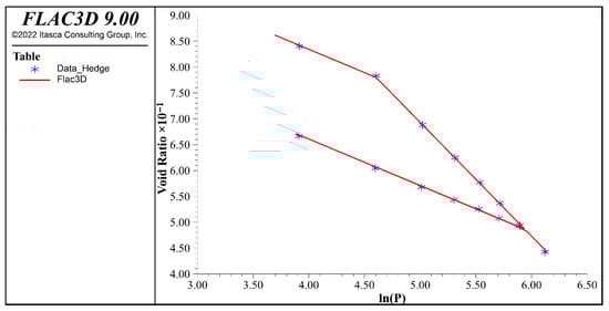 Using the modified cam clay (MCC) model is indeed a suitable method for simulating the behavior of normally consolidated and slightly consolidated soils. The MCC model can capture the key features of soil behavior during consolidation and shearing processes. It considers the soil’s compressibility, hydraulic conductivity, and strength parameters, making it an effective choice for analyzing the soil’s response to loading and deformation. The MCC model parameters listed in Table 2 were sourced from a paper by Hedge and Sitharam (2015) [25]. In Figure 3, a comparison between the simulated responses of the soil under isotropic consolidation and the laboratory records is presented.